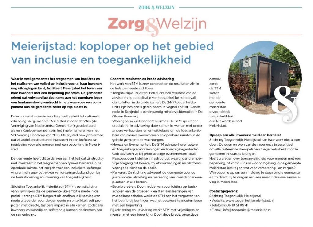 Deze vooruitstrevende houding heeft geleid tot nationale erkenning: de gemeente Meierijstad is door de VNG (de Vereniging van Nederlandse Gemeenten) geselecteerd als een Koplopergemeente in het implementeren van het VN-Verdrag Handicap van 2016. Meierijstad bewijst hiermee dat zij actief en structureel investeert in een leefbare samenleving voor alle mensen met een beperking in Meierijstad.
